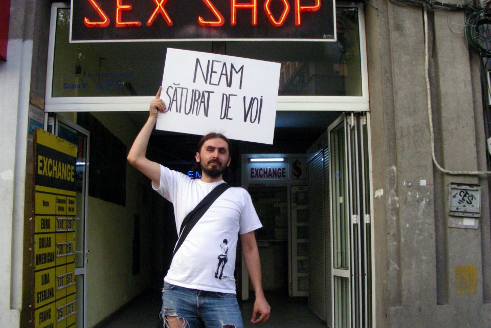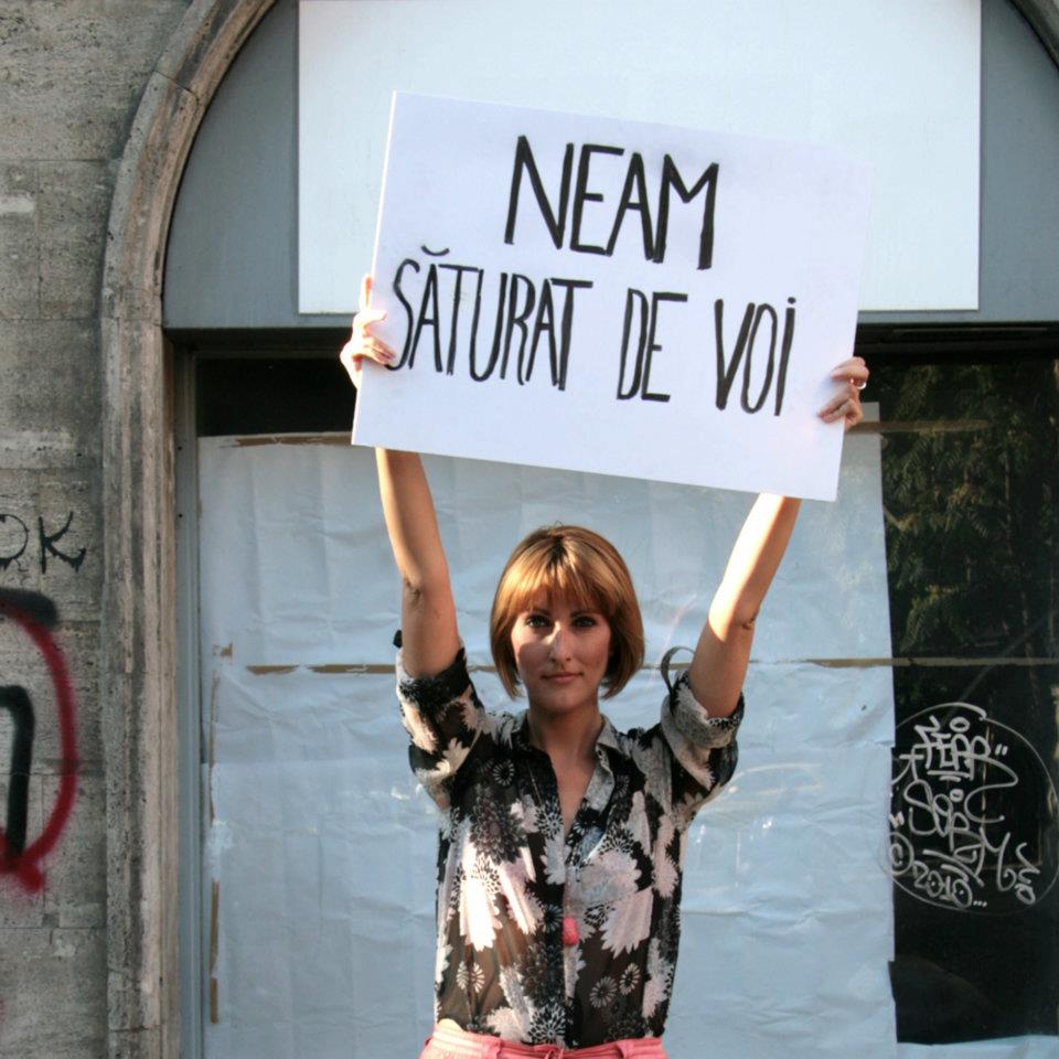 Cu pancarta in brate, cu mesajul NEAM SATURAT DE VOI catre exterior, Robert mergea pe strada Smirdan catre fosta cladire a Bibliotecii Nationale, avind-o pe Cosmina alaturi. Linga Cosmina eram eu. Paream un trio care vine la un meeting sau tocmai protesteaza. Oamenii se uitau: unii zimbeau, altii se incruntau. Dupa ce mi-a auzit remarca, Robert, continuind sa-si cizeleze proiectul aflat in desfasurare, i-a spus scurt Cosminei.
