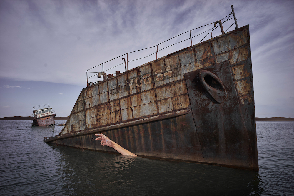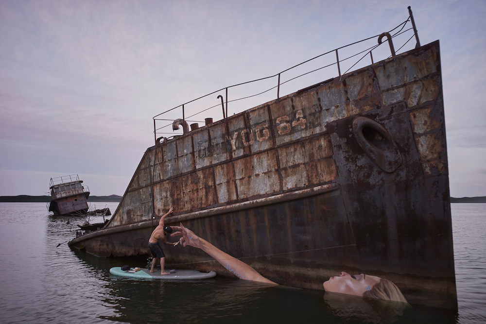 Cea mai nouă pictură realizată de Hula se numește „Come back” și a fost inspirată de maree. Pe un vapor mai vechi putem vedea capul unei femei și brațul ei întins, parcă voind să atingă intangibilul. E fascinant cum fluxul și refluxul dezvăluie sau ascunde părți ale desenului, astfel încât vedem doar mâna realizată foarte realist.