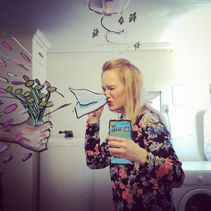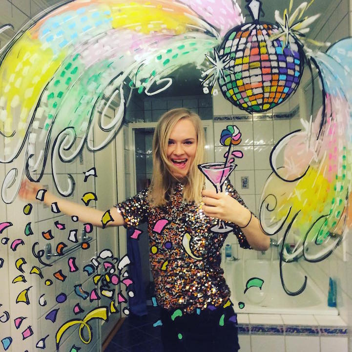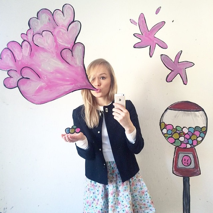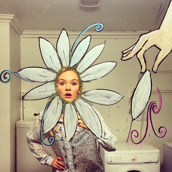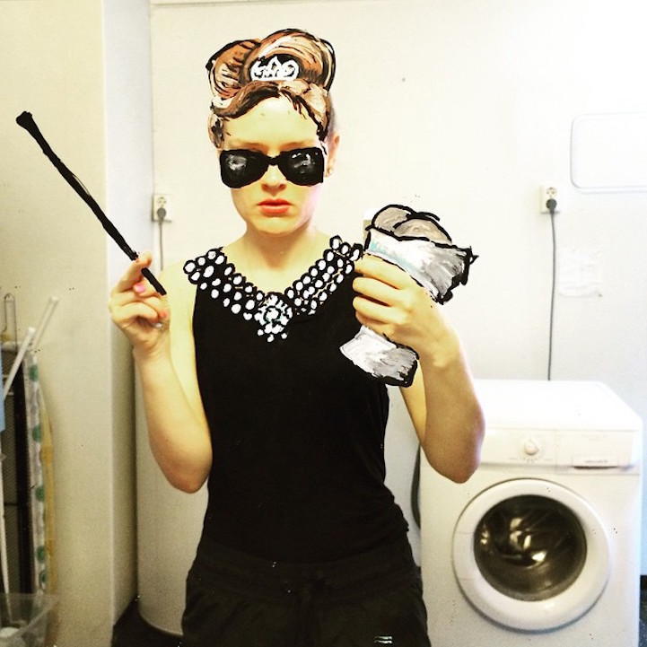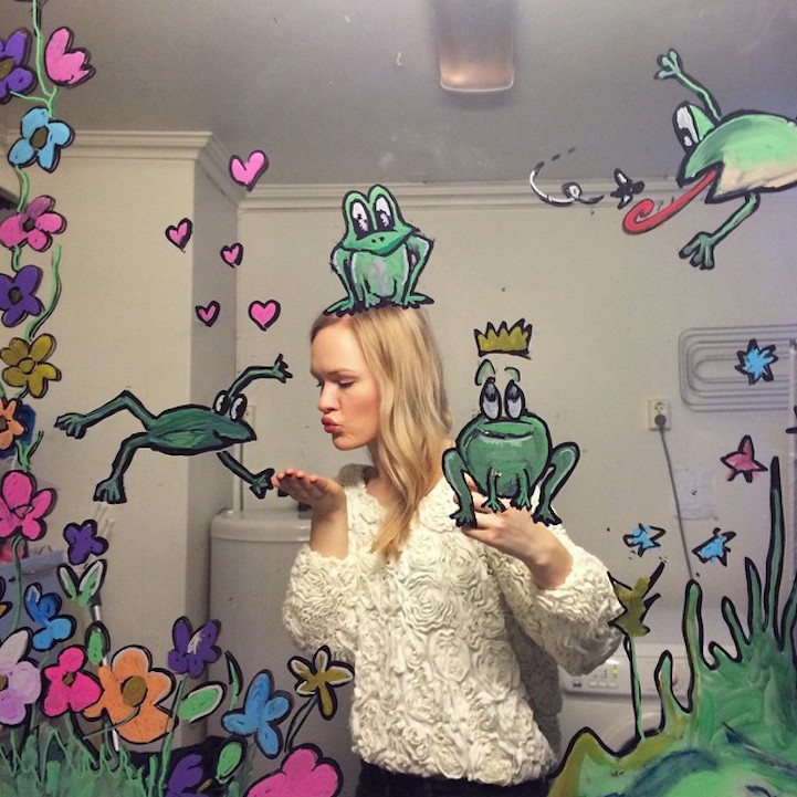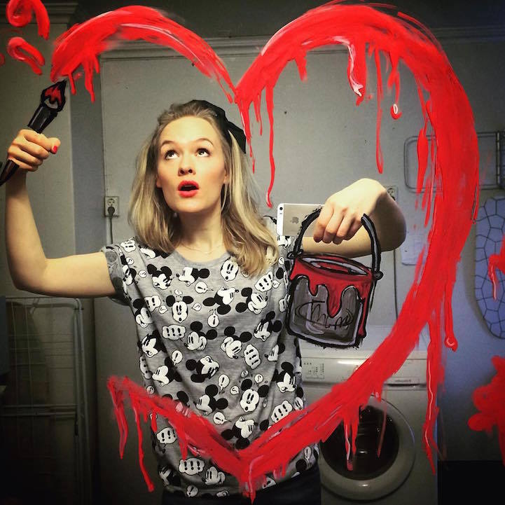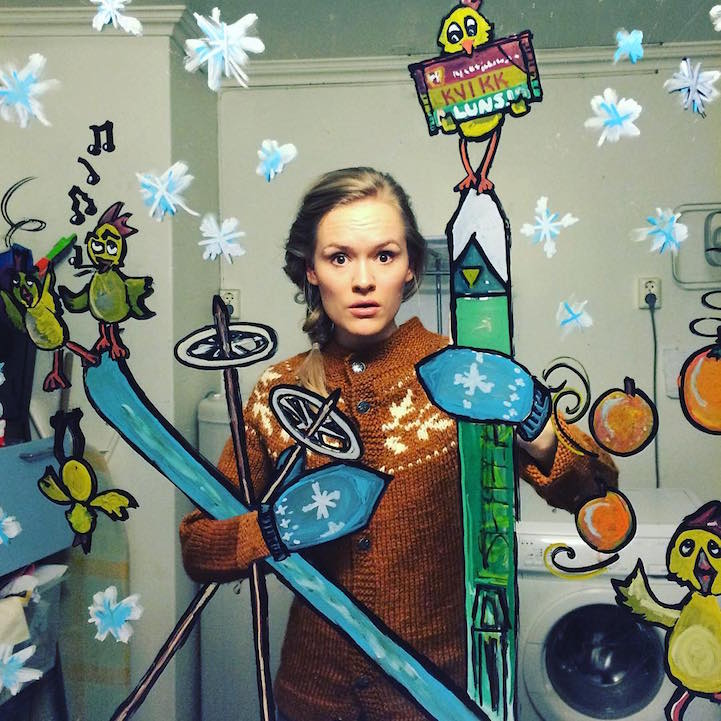 Helene este o artistă din Norvegia care nu are nevoie de prea multe lucruri pentru a face un soi de artă a generației millenials. Folosește un iphone pentru a se poza în oglindă și markere colorate pentru a crea o poveste pentru fiecare selfie în parte.