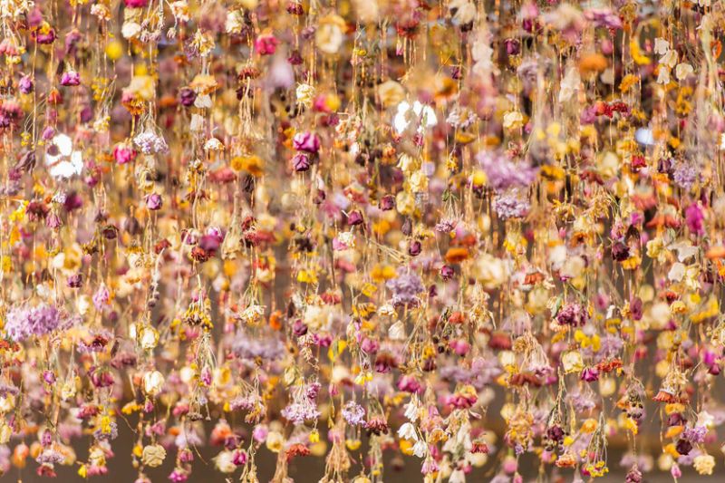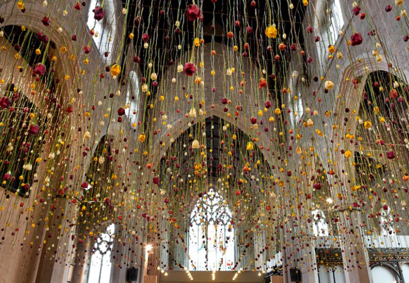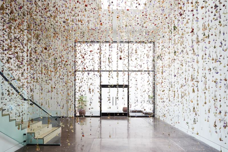 Daca ai visat vreodata sa ai un tavan acorperit cu sute de flori, te poti inspira de la Rebecca Louise Law, o artista britanica, specializata in instalatii si opere de arta alcatuite din materiale naturale: flori, ramuri, frunze si ferigi. Opera ei este fizica, feminina si senzuala, si aplica in mod constant jocul din relatia om – natura.